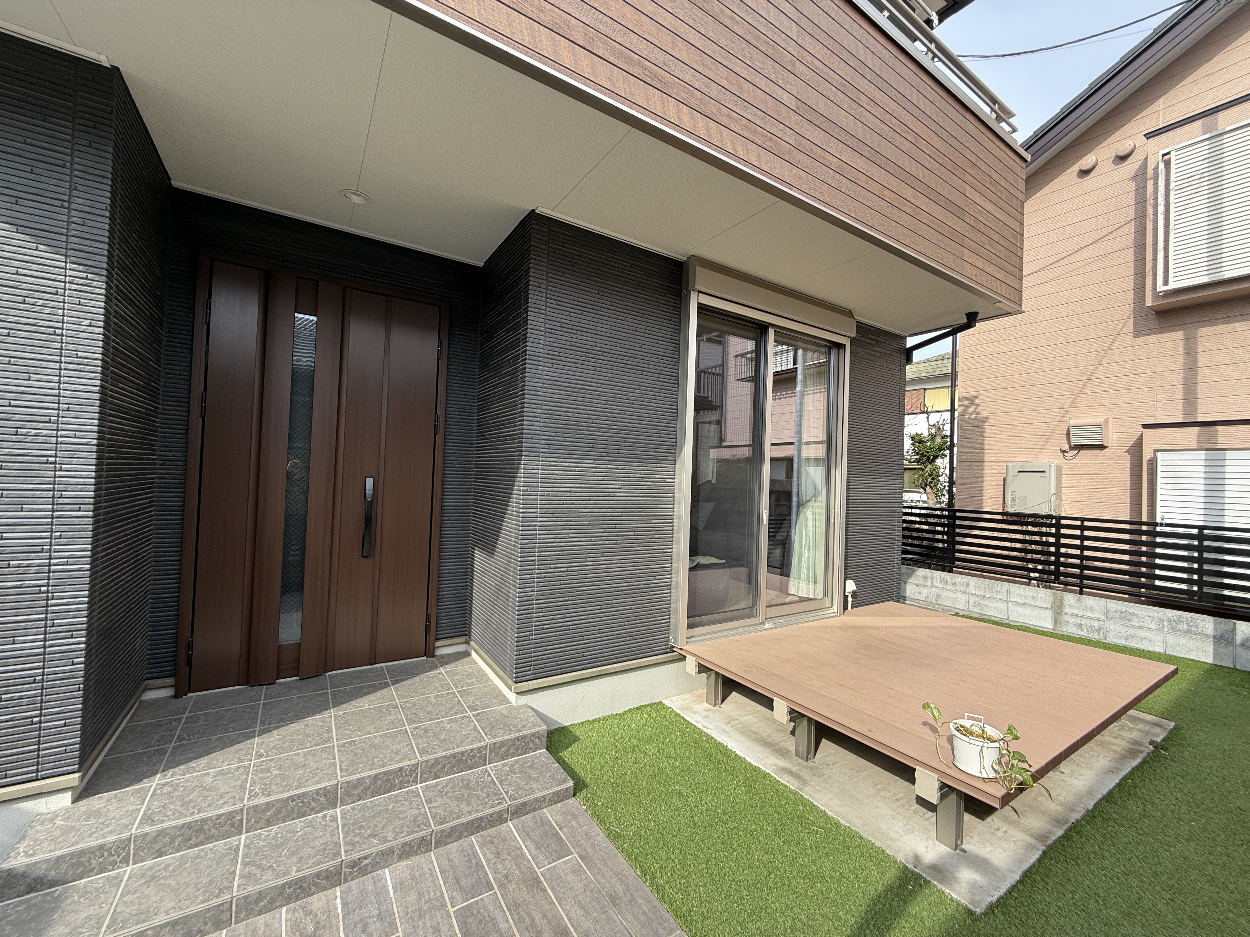 ブラック+ブラウンの木目がシックな雰囲気の外観です。
