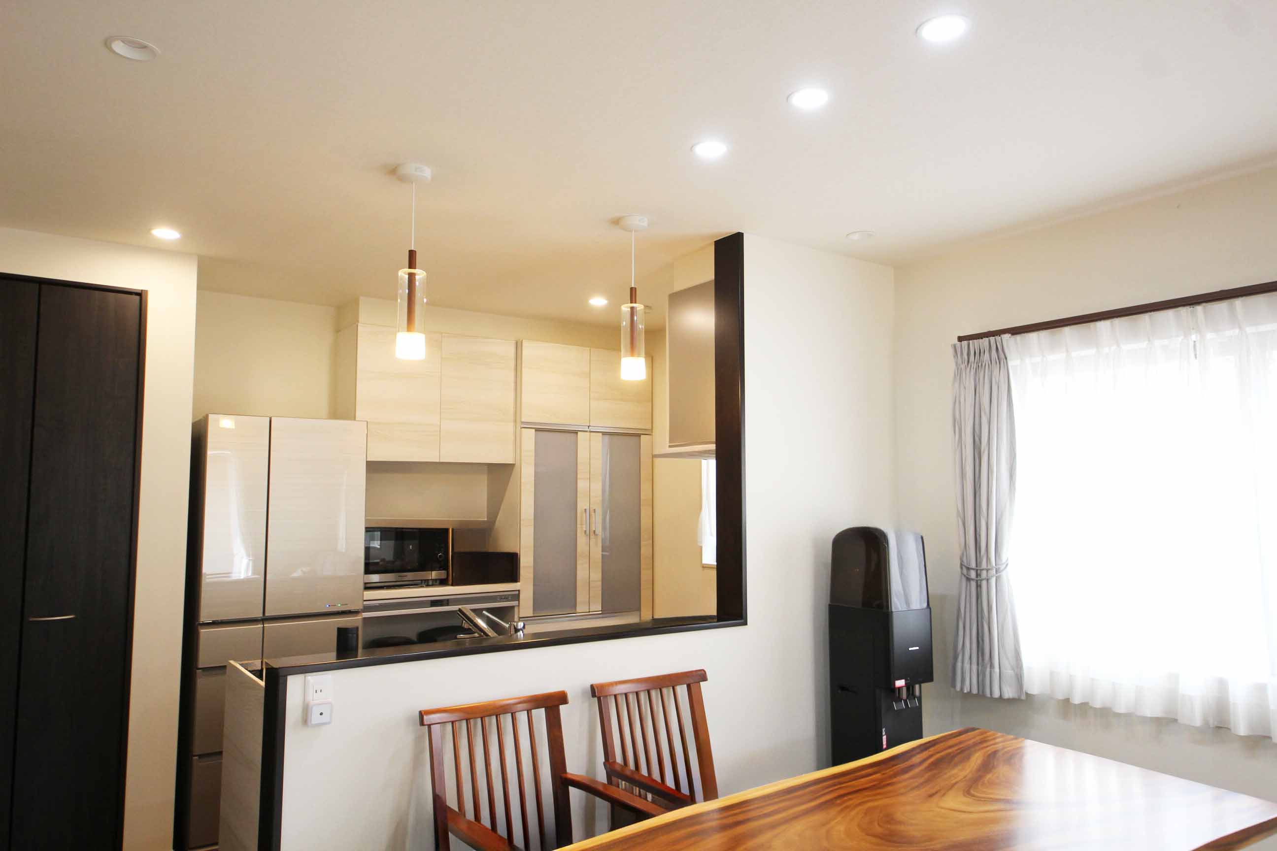 カウンターキッチン上のペンダントライトがスタイリッシュな雰囲気を醸し出します。