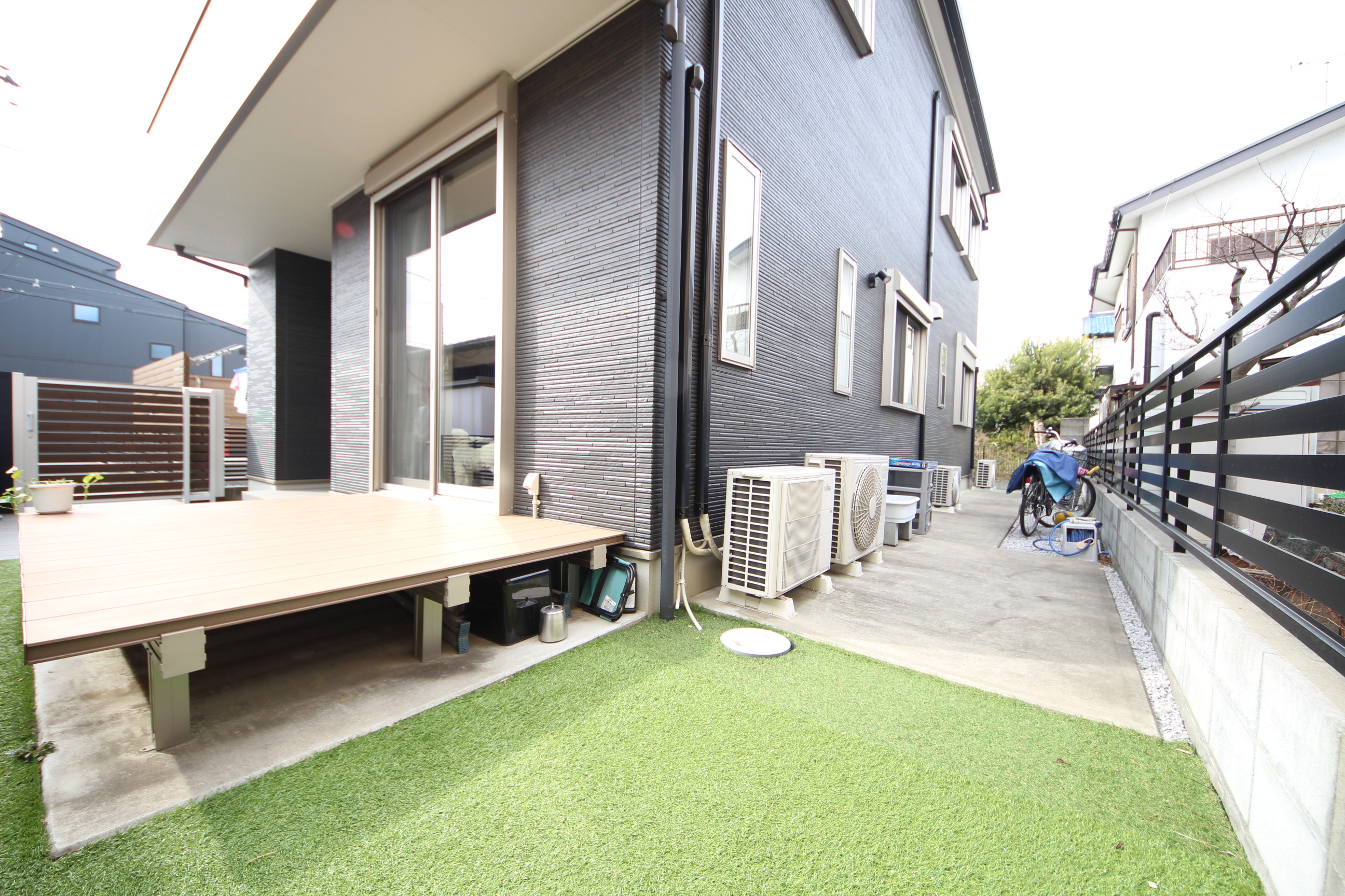LDKからウッドデッキに出ることが出来ます。お庭の奥には自転車等を置けるスペースがございます。