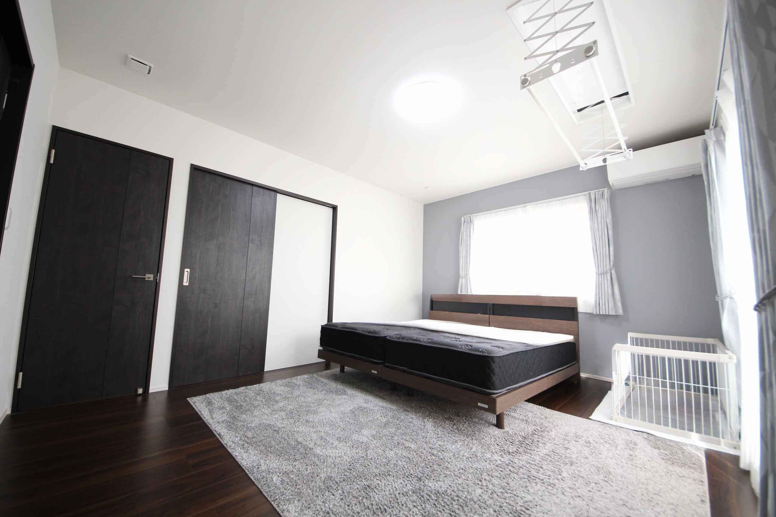 モノトーンで統一されたインテリアがお洒落な、2階約10帖洋室。WICと書斎がございます。