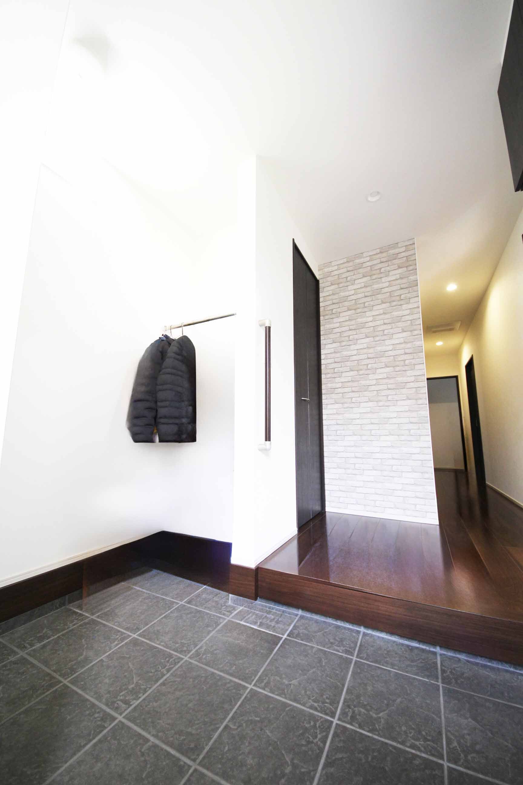 ゆとりある広さの玄関。入って左側にはSICと、上着を掛けられるスペースがございます。