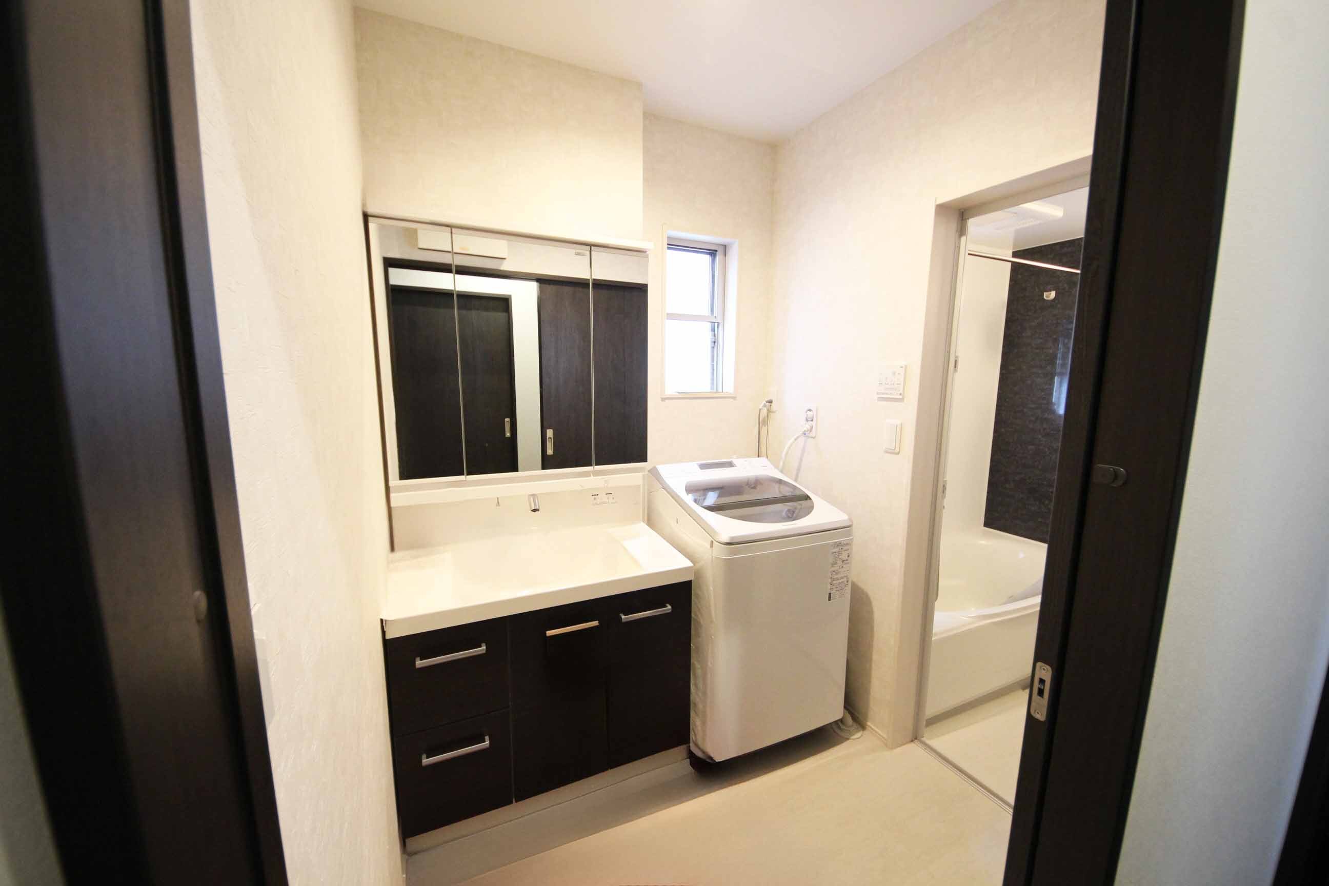 三面鏡付きのワイドな洗面化粧台は朝の身支度もスムーズに行えます。収納も十分です。