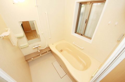 窓付きの明るいバスルーム。足を伸ばしてゆったりと寛げます。